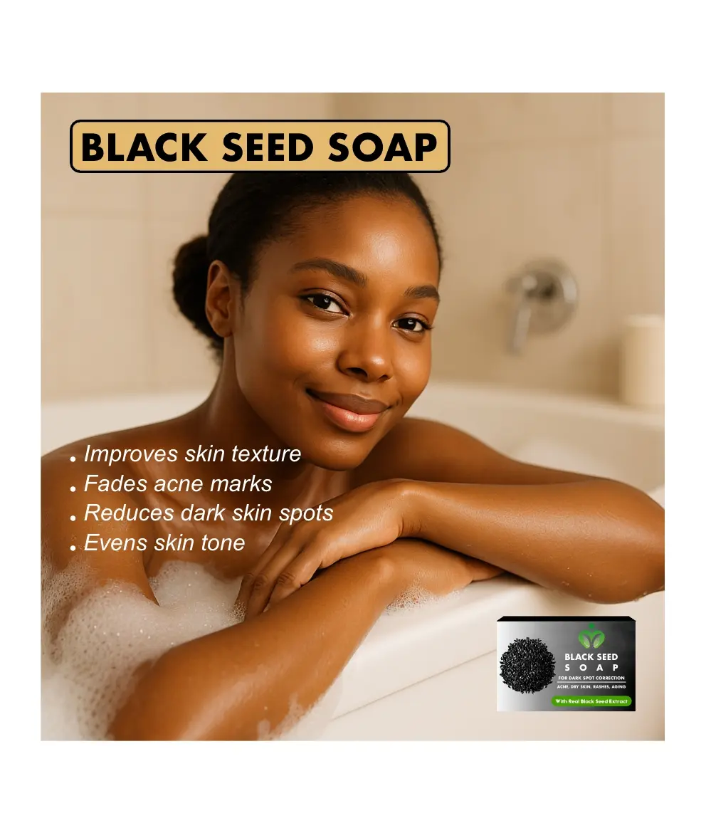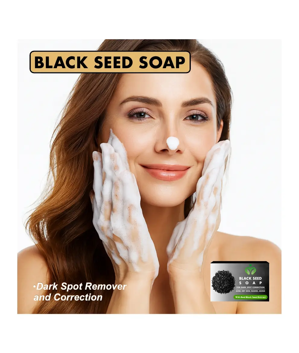 Black Seed Soap is an ultimate skin care solution infused with black seed extract, formulated to address dark spot correction, acne, dry skin, rashes, and anti-aging. This versatile soap can be used on your face, hands, body, neck, bikini area, inner thighs, and underarms. To use, simply wet your skin with warm water, apply the soap evenly, massage gently for 20-30 seconds, and then rinse thoroughly with water.
