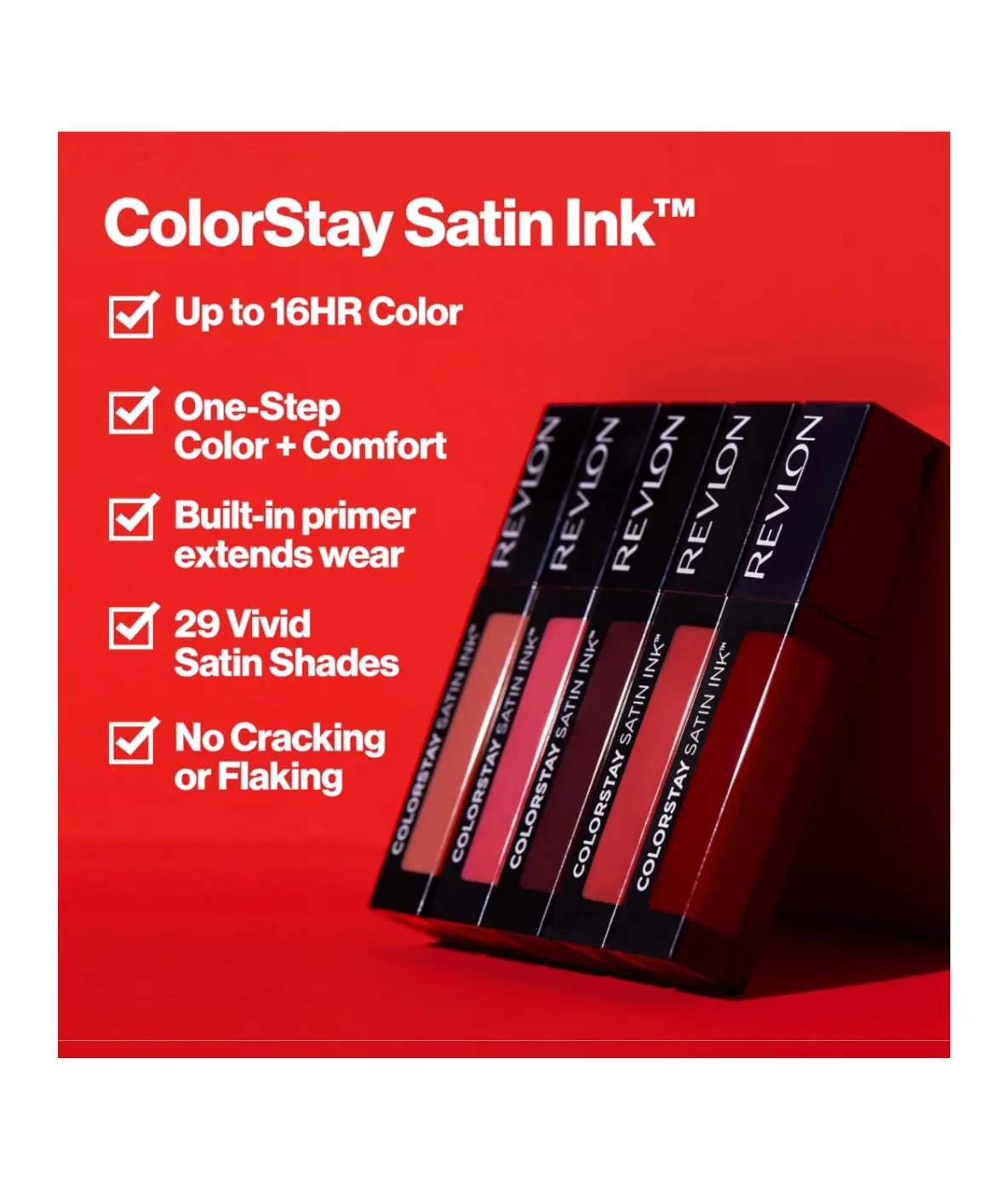Revlon Satin Ink Lipstick delivers 16 hour color with a hydrating satin finish. Enriched with black currant oil and vitamin E. Transfer resistant and comfortable. No touch-ups needed.