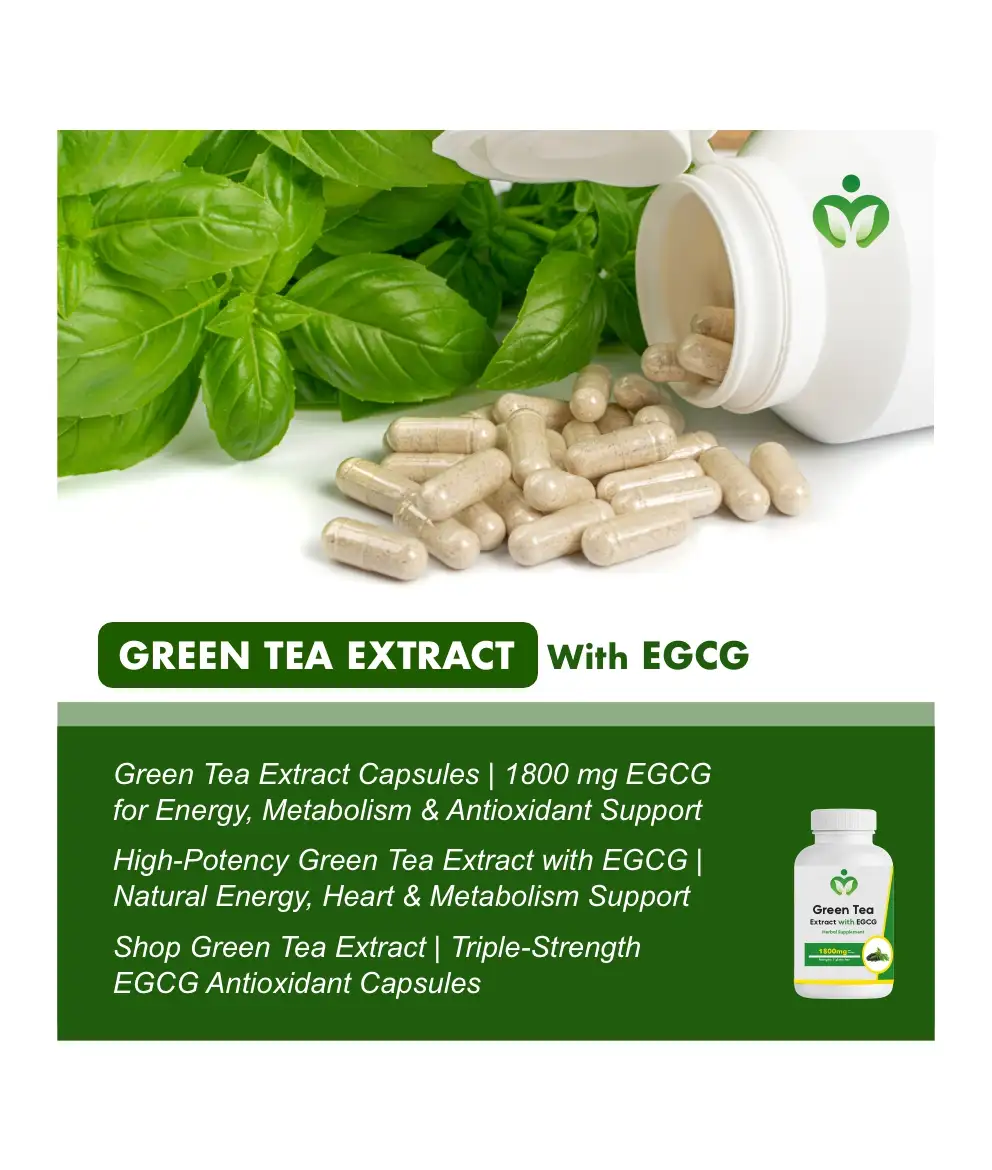 Premium Green Tea Extract standardized to 1800 mg EGCG (Epigallocatechin Gallate) per serving, providing concentrated antioxidants and polyphenols. Formulated with a vegetable cellulose capsule (plant-based) and natural excipients to ensure purity and stability. Free from preservatives, artificial additives, gluten, soy, dairy, and GMOs.