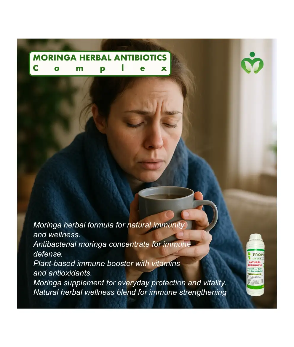 Moringa Herbal Antibiotics Complex is intended for supportive wellness use and should not replace prescribed medical treatment for severe or acute infections. Individuals who are pregnant, nursing, taking medication, or managing chronic health conditions should consult a qualified healthcare provider before use. Discontinue immediately if any signs of allergic reaction, discomfort, or adverse effects occur. Do not exceed the recommended dosage, and avoid use in children unless approved by a healthcare professional. If symptoms persist, worsen, or are accompanied by fever, consult a medical practitioner promptly. Store in a cool, dry place away from direct sunlight and keep out of reach of children.