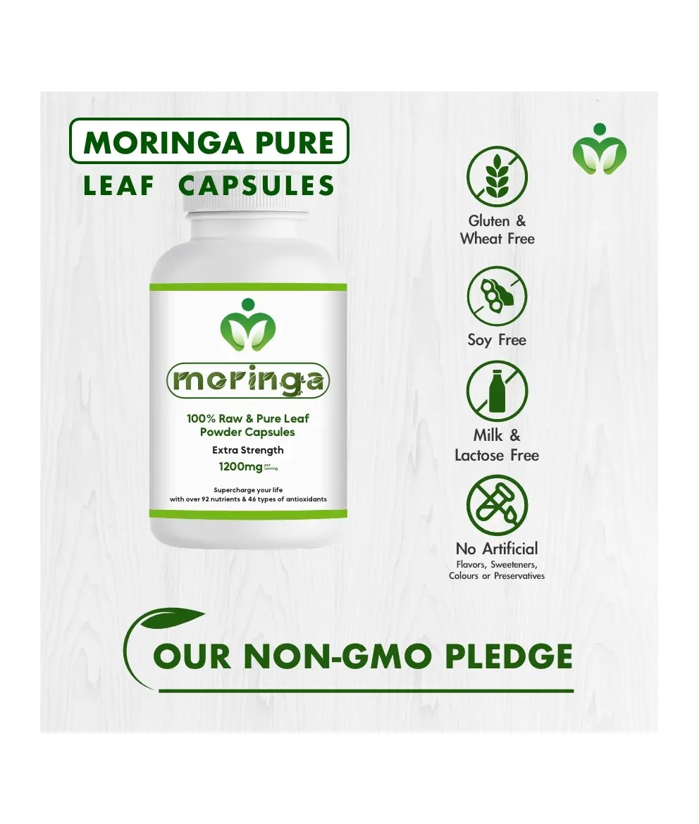 100% Pure Organic Moringa Oleifera Leaf Powder, encapsulated in a vegetable cellulose capsule (plant-based). Contains naturally occurring vitamins, minerals, antioxidants, and phytonutrients. No artificial additives, preservatives, fillers, binders, pesticides, GMOs, gluten, soy, or dairy.