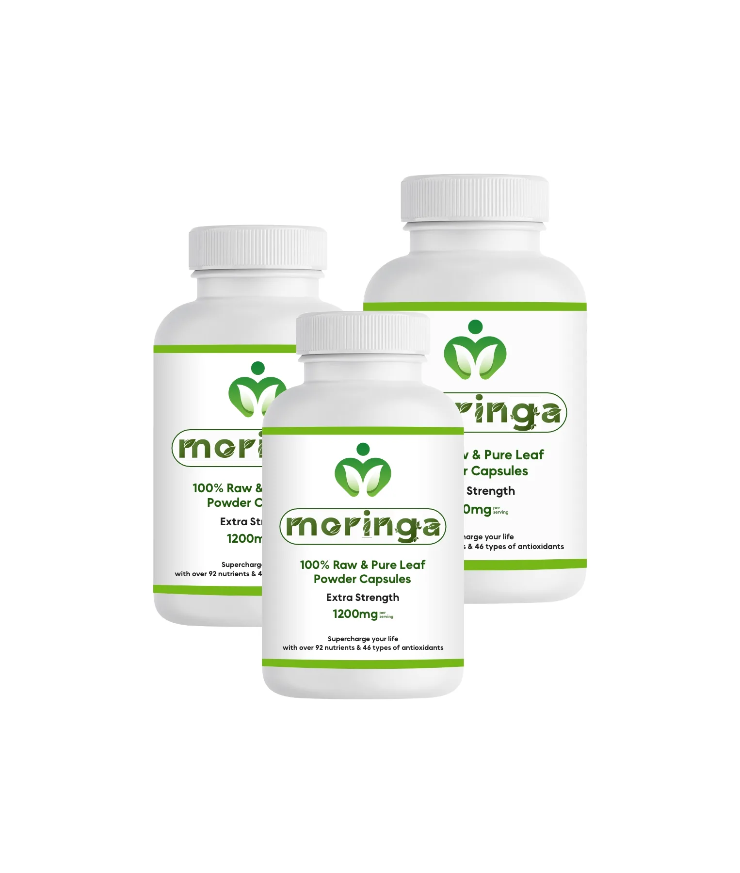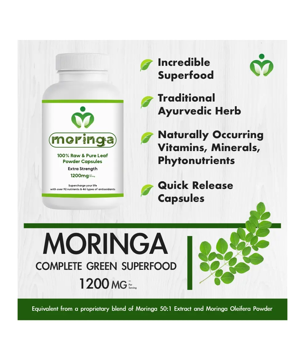 For adult use only. Do not exceed the recommended dosage. If you are pregnant, breastfeeding, taking medication, or have a medical condition, especially related to thyroid function, blood pressure, or blood sugar regulation, consult a healthcare provider before use, as moringa may influence these systems. Discontinue use if you experience stomach discomfort, allergic reactions, or any unusual symptoms. Individuals with known allergies to plants in the Moringaceae family should avoid this product. Keep out of reach of children. Store in a cool, dry place with the bottle tightly closed to maintain freshness and potency. This supplement is not intended to diagnose, treat, cure, or prevent any disease.