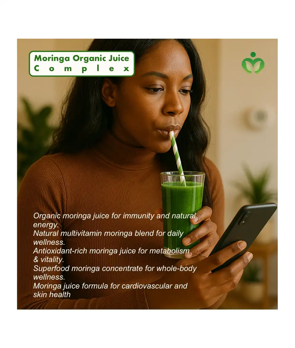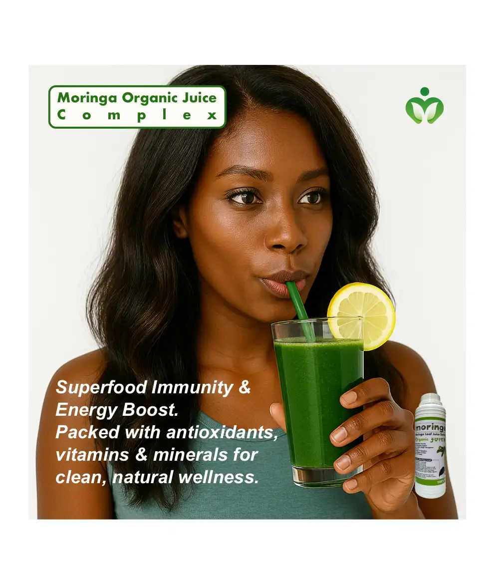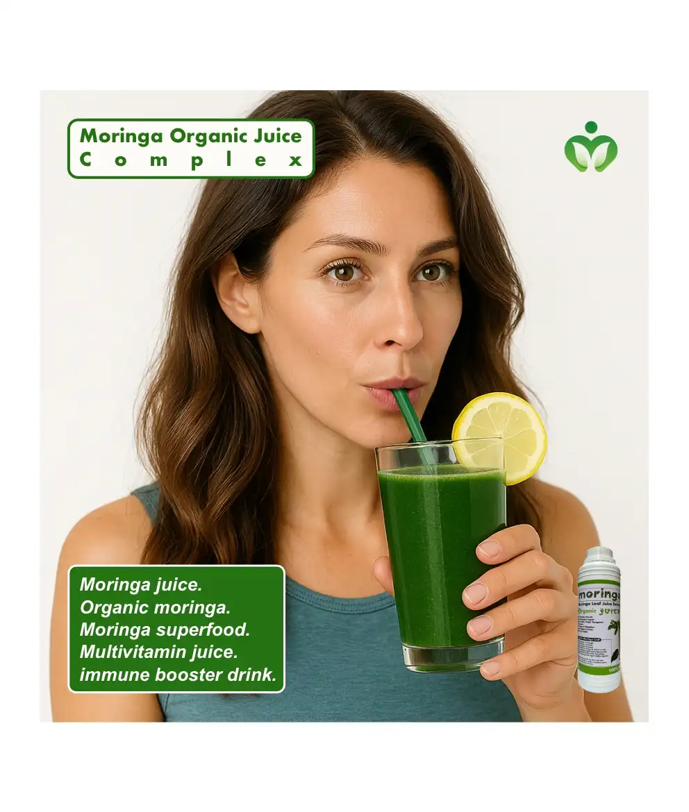 Moringa Organic Juice Complex is an all-natural multivitamin super juice crafted from premium organic moringa leaves to deliver comprehensive health benefits. This potent concentrate boosts immunity with vitamins A, C, E, zinc, and iron; enhances energy through B vitamins that optimize metabolic conversion; and accelerates metabolism for improved weight management. Rich in antioxidants like quercetin and chlorogenic acid, it combats oxidative stress, reduces inflammation, and supports cellular health. The 100% organic formula, free from synthetic additives, provides a convenient, delicious way to promote cardiovascular wellness, skin vitality, and overall well-being. For optimal results, Take a quarter to half a glass three times daily, consistently, and consult a healthcare provider if pregnant, nursing, or on medication. Embrace this nutrient-dense superfood for a vibrant, healthier lifestyle.