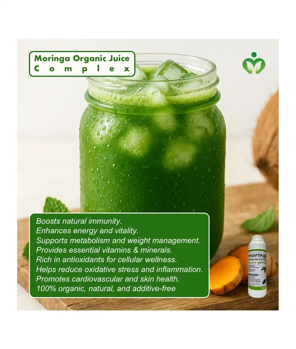 Moringa Organic Juice Complex is produced using carefully selected, organically grown moringa leaves to ensure maximum purity, potency, and nutritional value. This highly concentrated formula provides a complete spectrum of vitamins, minerals, and phytonutrients that support whole-body wellness, including improved digestion, enhanced circulation, balanced energy levels, and emotional well-being. Its natural antioxidant profile helps protect cells from environmental stressors, while its anti-inflammatory properties assist in maintaining long-term health and vitality. Suitable for adults of all ages, this versatile superfood juice can be easily incorporated into any daily routine and complements a balanced diet and active lifestyle. Store in a cool, dry place, refrigerate after opening if required, and shake well before each use to maintain freshness and consistency.