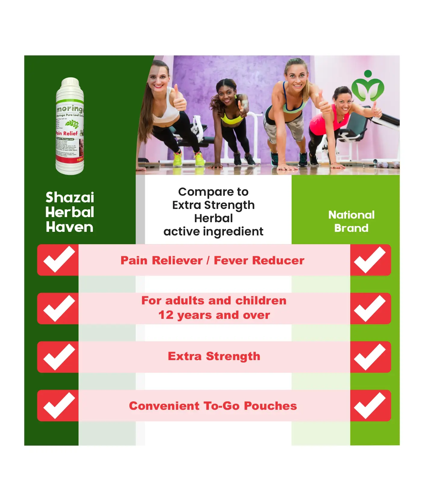 Moringa Pain Relief Complex provides natural relief from fever, muscle pain, back discomfort, joint inflammation, headaches, and toothaches. Its blend of moringa and complementary herbs offers anti-inflammatory, analgesic, and antipyretic properties to reduce inflammation, soothe tissues, and promote healing. It also supports improved mobility and overall well-being.