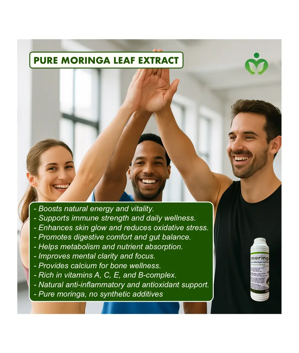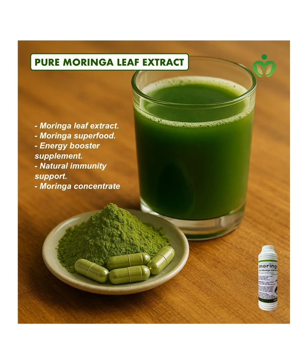 Pure Moringa Leaf Extract is made from 100% premium moringa (Moringa Oleifera) leaves, carefully processed into a concentrated liquid to preserve maximum nutrient potency. Naturally rich in vitamins A, C, E, and B-complex, it also contains essential minerals such as calcium, potassium, magnesium, and iron. The extract provides powerful antioxidants, amino acids, chlorophyll, dietary fiber, and plant-based anti-inflammatory compounds including quercetin and isothiocyanates. Free from synthetic additives, preservatives, fillers, artificial colors, or flavors, this pure plant-based formula delivers a clean, nutrient-dense wellness concentrate.