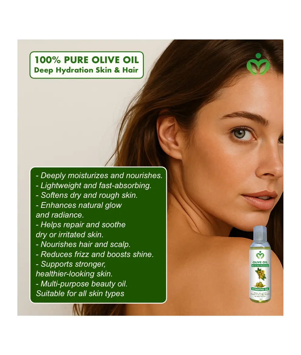 Pure Olive Oil for Skin and Hair is a 100% pure, natural expeller-pressed beauty oil designed to deeply moisturize, nourish, and soften the skin and hair. Rich in vitamins A, E, and essential fatty acids, this lightweight oil provides long-lasting hydration while supporting a smooth, healthy-looking glow. Perfect for the face, body, scalp, and hair, it absorbs quickly. Its soothing properties help comfort dry or irritated skin, support moisture repair, and maintain a soft, radiant complexion throughout the day. For hair, it helps reduce dryness, boost shine, and support a healthy scalp. Suitable for all skin types, including sensitive skin, Olive Moisturizing Oil is completely free from additives, fragrances, and chemicals, offering a clean, natural approach to everyday beauty and hydration.