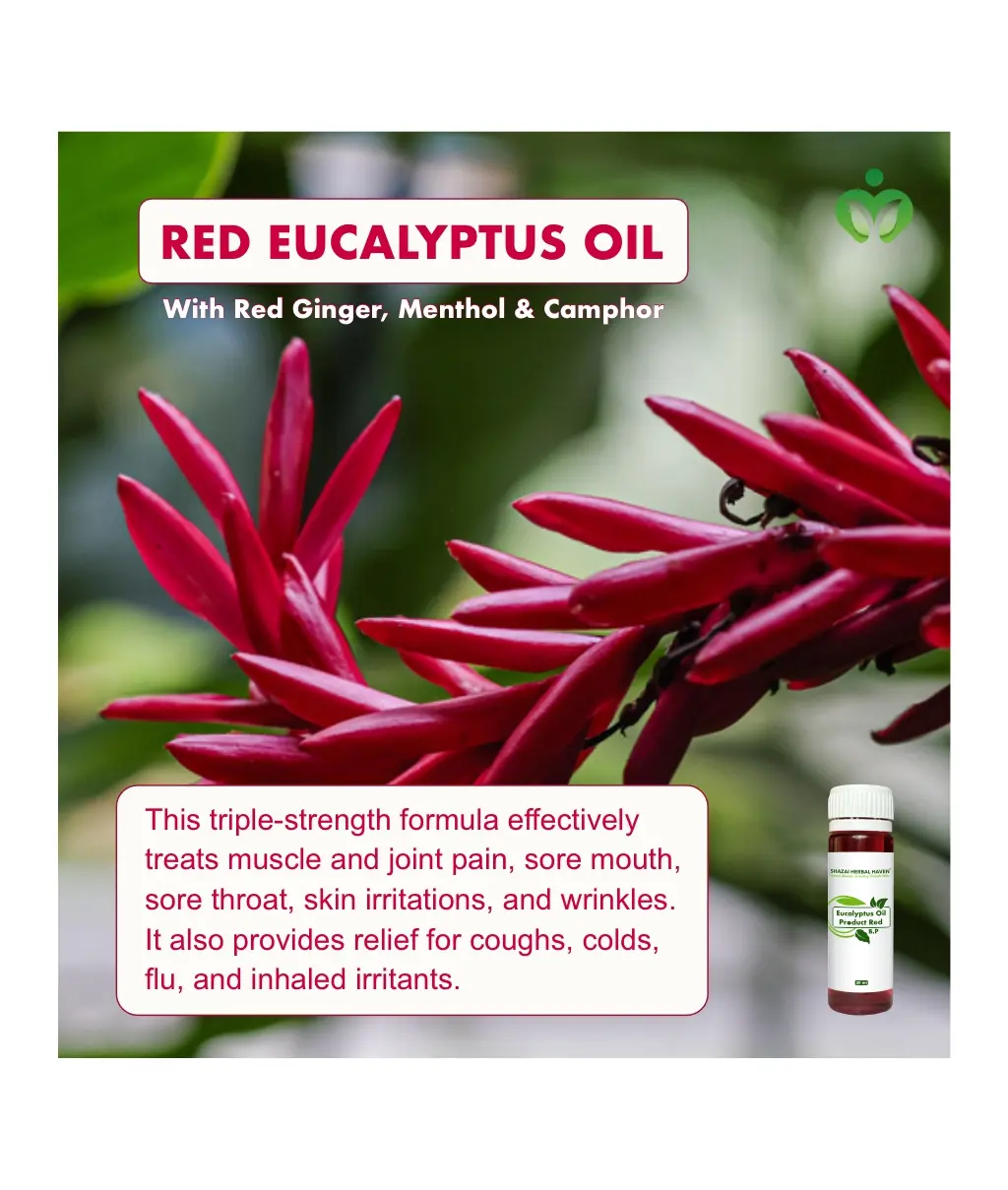 Red Eucalyptus Oil is a potent triple-strength blend enhanced with red ginger, menthol, and camphor, offering versatile relief for muscle and joint pain, sore throat, skin irritations, and respiratory issues like coughs and colds. Its anti-inflammatory and antimicrobial properties reduce pain, soothe skin, clear congestion, and even smooth wrinkles by boosting collagen. Apply topically for pain or skin care, gargle for throat relief, or inhale steam for respiratory benefits. This high-quality, concentrated formula is ideal for natural, multi-purpose therapeutic use. Always dilute for sensitive skin and avoid internal use without professional guidance.