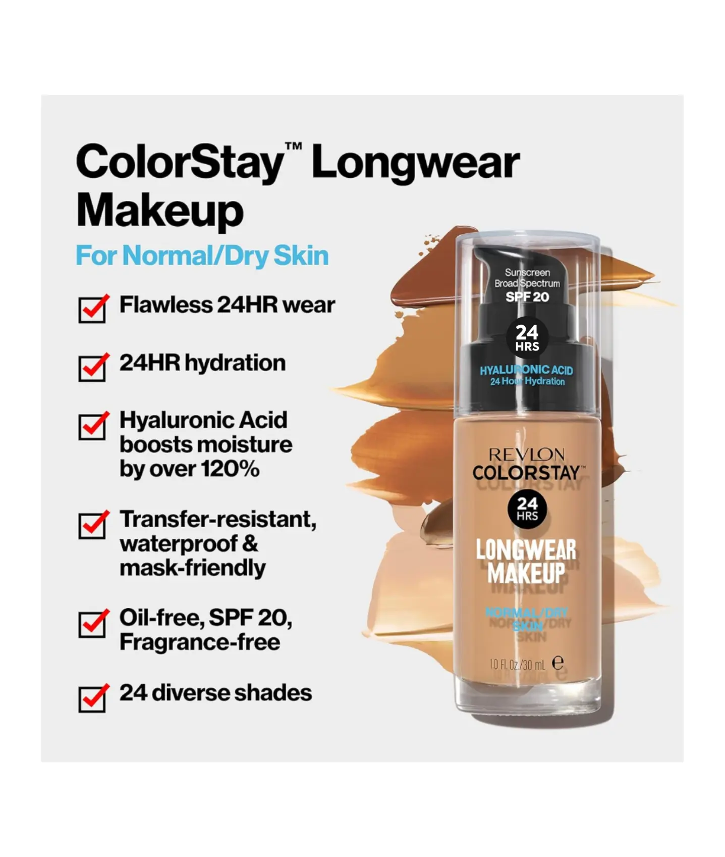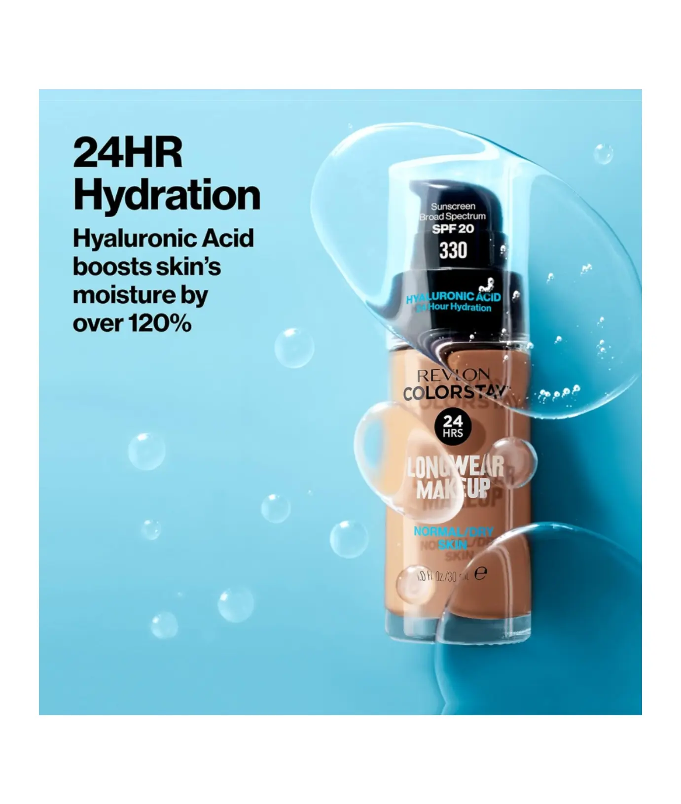 Revlon ColorStay Makeup offers full coverage with SPF 20 and hyaluronic acid. Lasts 24 hours. Transfer-resistant and hydrating. For normal to dry skin.